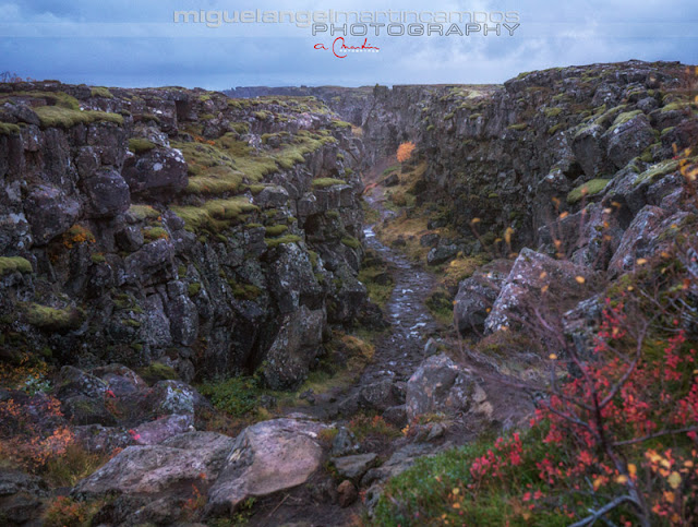 A esas horas ya cada vez había menos luz y dudamos durante unos minutos en que camino elegir para llegar a Oxararfoss. Desde Lögberg, un cartel nos indicaba que para llegar a la catarata teníamos que recorrer unos 800 metros a pie. Pero en mis notas llevaba una segunda forma de acceder a la cascada que no sabíamos si sería mas corta, aunque seguramente fuese mucho mas especial.